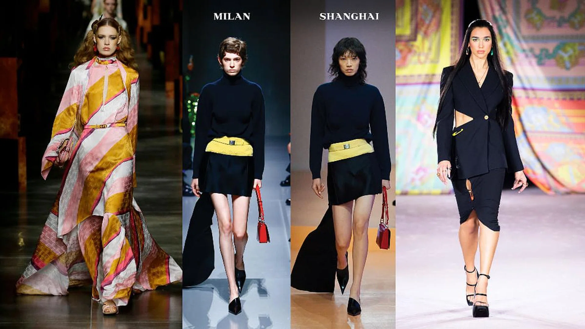 Versace 2022春夏系列时装秀,由歌手Dua Lipa担任开场与闭场模特,伴随着她风靡全球的流行乐节奏,她身着安全别针镂空西装与霓粉色金属织物礼裙,尽显女性的自信姿态。