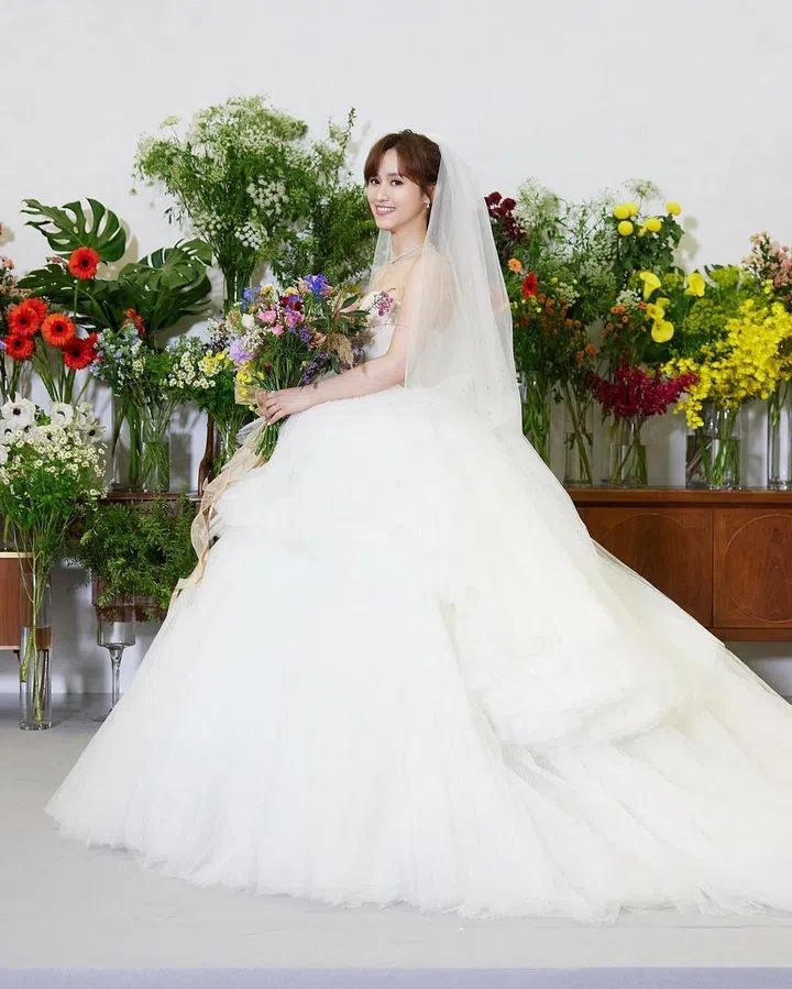 在朴信惠的个人照中,手捧白色献花,巧妙遮住了孕肚。她选择了Monique Lhuillier 2022春季婚纱系列中的薄纱礼服,裙子上绣有精致的野花点缀,与照片中的花丛相辅相成,富有仙气灵动之美。