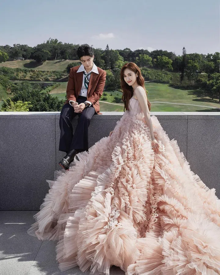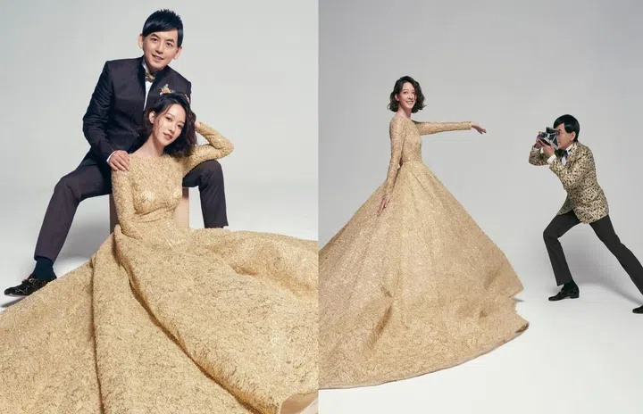在黄子佼与孟耿如的婚纱照中,新娘身着Nicole + Felicia金色定制礼服,这款量身定制的婚纱由法国进口的金色类似,搭配金色手工珠材打造,贴身的剪裁,勾勒出苗条身段,美丽动人。