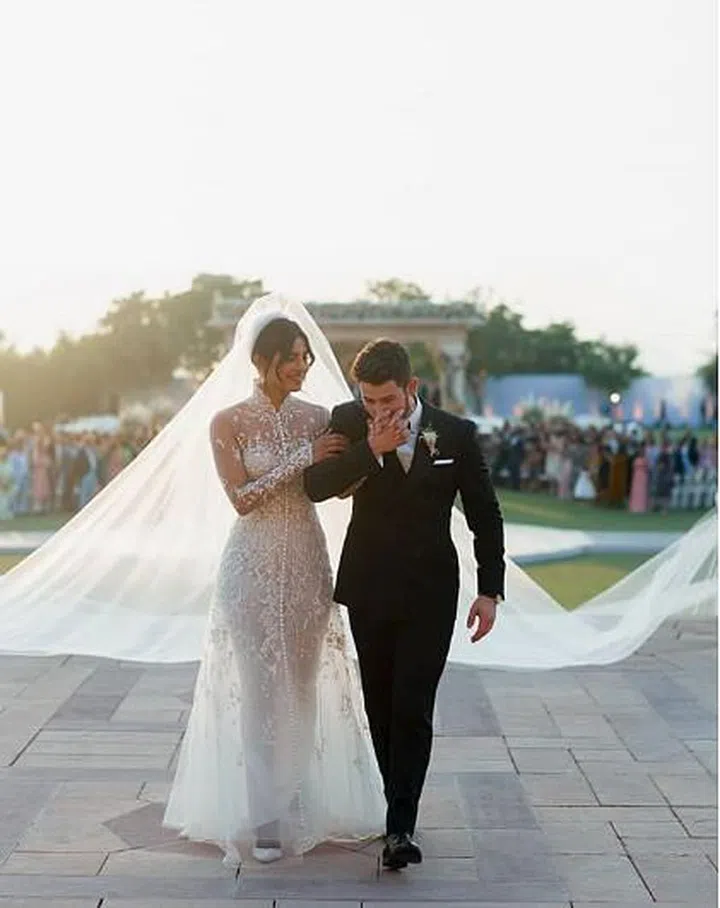 36岁的印度女星Priyanka Chopra与小10岁的美国歌手Nick Jonas交往两个月后在2018年7月闪电订婚。同年12月,小两口特地飞回女方的家乡印度,在其著名的焦特布尔市(Jodhpur)举行超盛大婚礼。Priyanka Chopra当天身穿Ralph Lauren定制高领婚纱,以手工串珠与手工刺绣制成,饰有花卉图案与蕾丝细节。婚纱共花上1826小时完成,绣有水晶珠子和施华洛世奇水晶,最后以135个缎面纽扣缝合。另外,内搭裙装由238万颗珍珠贝母亮片组成,做工精致。Priyanka Chopra所戴的头纱更是长达22.5米,相当大气,令人惊艳。