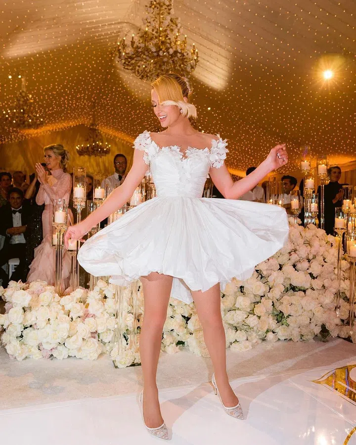 进入婚宴会场时,Paris Hilton换上一袭 Oscar de La Renta俏皮精致的短裙,呈现俏皮华丽的气息,舒适的长度让她能自在地走动和跳舞。