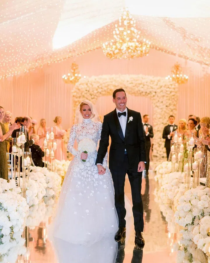 Paris Hilton 与认识了15年的风险投资家Carter Reum于2021年11月11日步入婚姻的礼堂。婚礼上,新娘身穿Oscar de La Renta设计师Fernando Garcia 和 Laura Kim耗时数月打造的精致婚纱礼服,领口上点缀着一束浪漫的象牙压花,糅合超过20层的刺绣薄纱悬垂在衬裙上,象征永恒、优雅、别致之美。