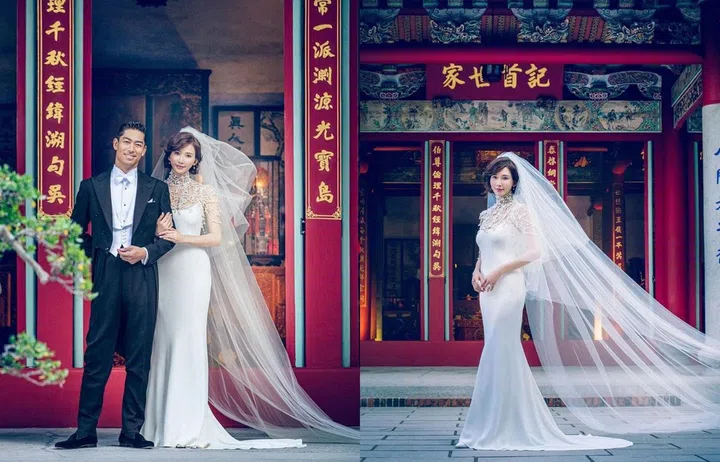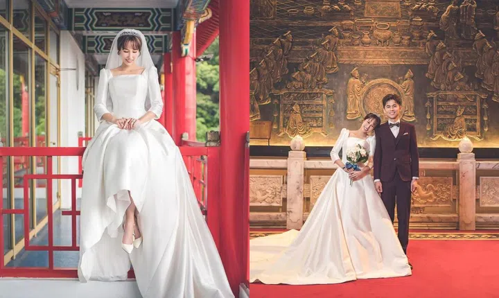 本地歌手潘嘉丽与音乐制作人游政豪交往1年后,于今年2月在台湾完成结婚登记。由于疫情的影响,两人将婚礼延至11月20日于台北晶华酒店举办。新娘透过社交媒体秀出多张婚纱照,场景特地选在两人结识的“定情地”圆山酒店拍摄,意义非凡。潘嘉丽的婚纱来自台北的Grace Kelly婚纱店,走经典高雅的风格,方形领口露出漂亮锁骨,裙身没有多余的装饰花纹,修身的剪裁配缎面材质更添奢华感。Kelly依靠在在老公的肩膀,小两口的脸上洋溢着幸福的笑容。