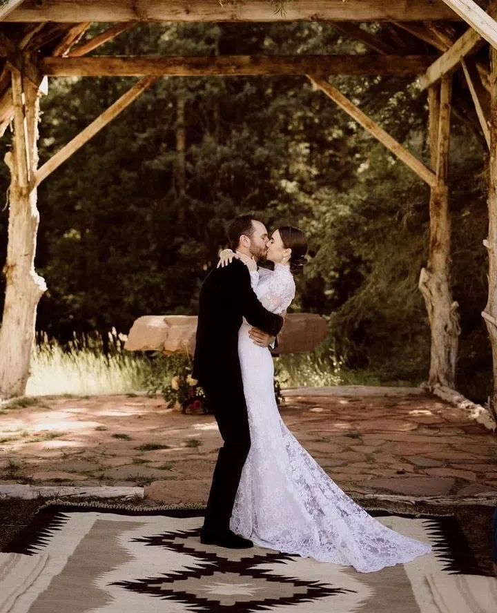 因戏剧《Emily In Paris》再登事业高峰的Lily Collins,选择了Ralph Lauren的蕾丝婚纱,并择在美国科罗拉多州的邓顿温泉(Dunton Hot Springs, Colorado)举行私人的森林风格婚礼。这套白色婚纱带有蕾丝连帽设计,仙气十足,与传统面纱略有不同,彰显了新娘独特美感。