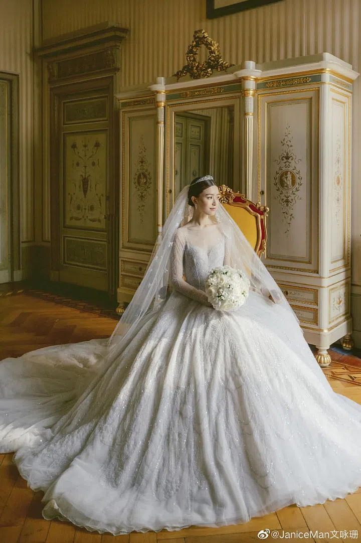香港艺人文咏珊(Janice Man)与相恋5年的男友吴启楠(Carl)今年9月在香港低调注册,个月则在意大利Lake Como湖畔古堡Villa Erba举行盛大婚礼,邀请200名亲友到场见证爱情。她在婚礼上换上十套礼服,其中这套主婚纱来自澳洲品牌Paolo Sebastian,10尺长的裙摆镶满水晶,让新娘子闪亮动人。