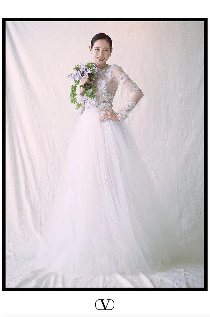 身为Valentino代言人的孙艺珍,在婚礼前曾为品牌拍摄时尚大片时,身穿由创意总监Pierpaolo Piccioli设计的花卉刺绣薄纱礼服,出自Valentino Promenade系列,配上高级珠宝尚美巴黎(Chaumet)的Joséphine耳环。