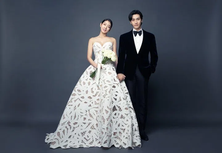 韩国演员朴信惠在2018年认爱小1岁的男星崔泰俊,并在2021年11月宣布“双喜临门”的喜讯。小两口在2022年得1月22日举行非公开的婚礼,所属经纪公司Salt娱乐也在婚礼举行前一连发出4张绝美婚纱照。在这张照片中,二人露出幸福的笑容,新娘身穿Oscar de le Renta 2022春季婚纱系列中的蕾丝刺绣镂空礼服,甜心领口展现漂亮锁骨,大气而典雅。