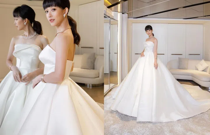 台湾知名主持人黄子佼与孟耿如原定5月16日举办家宴,因疫情的缘故被迫取消。新娘日前试穿Nicole + Felicia婚纱,第一套白色缎面礼服来自品牌的2021秋冬高级定制系列,衬托出柔美与大气,特别迷人。