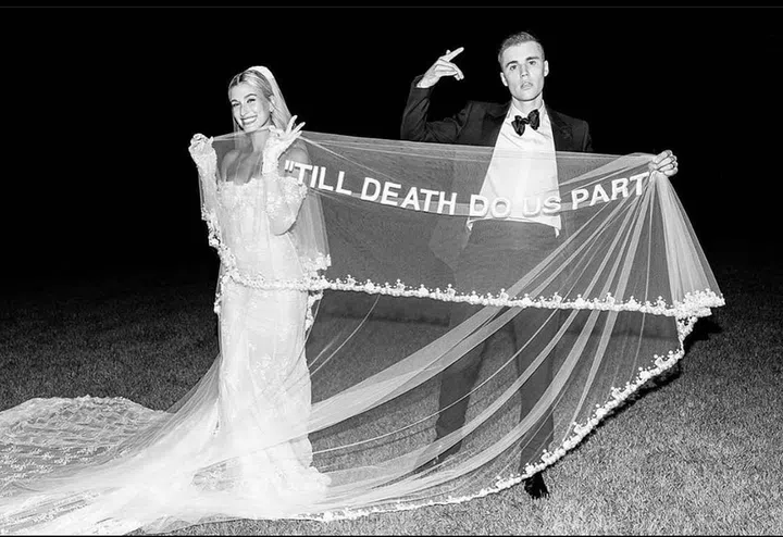 美国歌手Justin Beiber和Hailey Baldwin(现改称为Hailey Bieber)2018年领证结婚一年后,终于在隔年的9月30日于南加州补办婚礼,全程相当低调。新娘当天身着好友Off-White设计师Virgil Abloh量身打造的一字肩长袖婚纱,亮点则是Hailey头纱上的“till death do us part”,大方秀出爱的誓言。如此特别的巧思,不仅让婚纱变得独一无二,同时也保留了Off-White品牌的DNA特色。