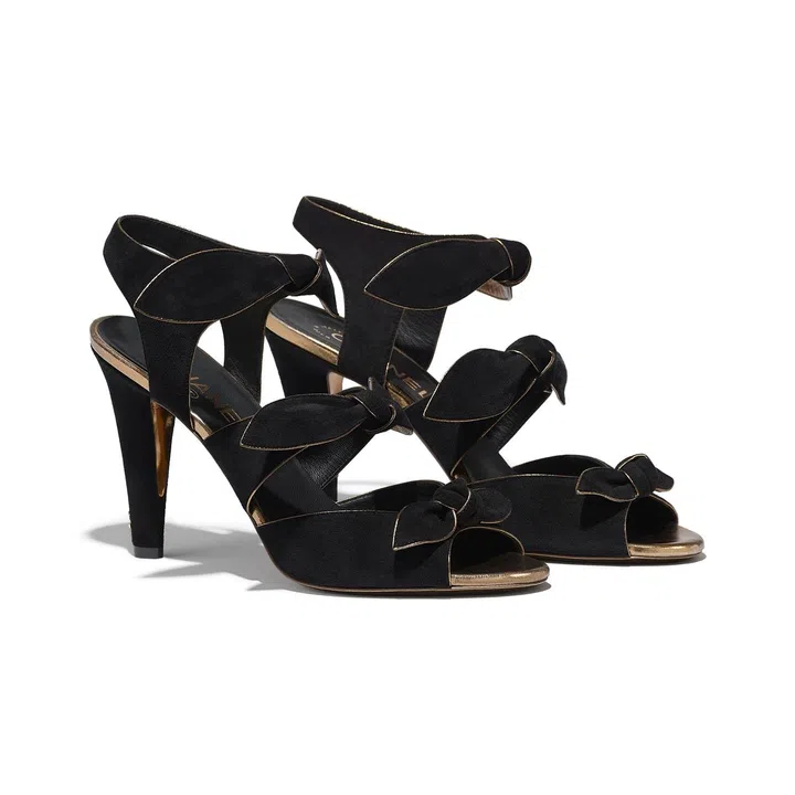 Chanel 麂皮绒小羊皮和小羊皮黑金色高跟凉鞋