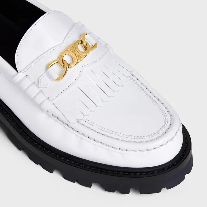 Celine的抛光牛皮革乐福鞋,融入了流苏设计和品牌经典的Triomphe链条。纯白色调百搭指数高,鞋型厚实沉稳,无论配搭西装套装或休闲牛仔裤装,能都为造型加分。