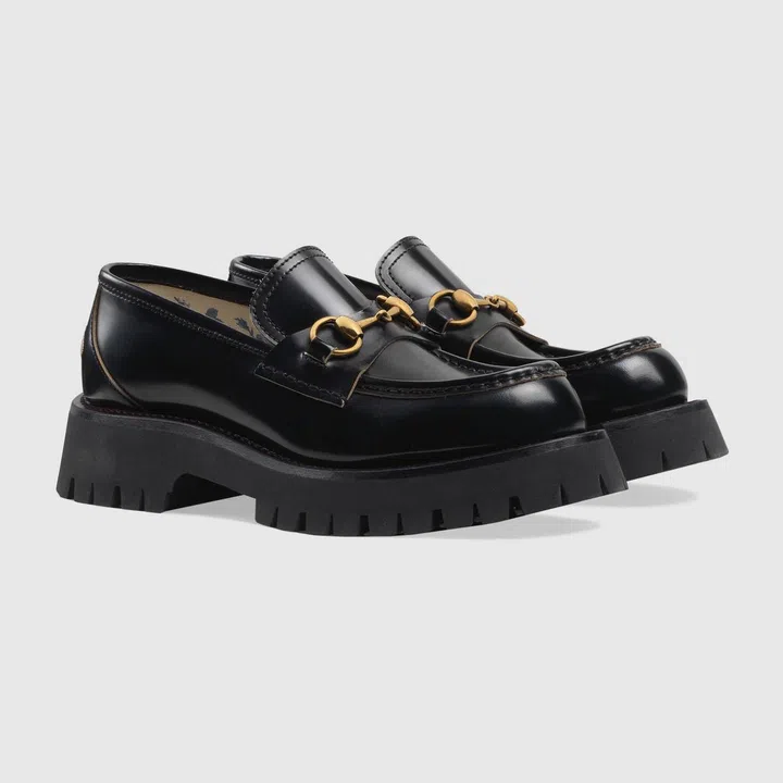 Gucci造型经典的厚底乐福鞋,采用黑色亮面皮革制作,以各种小细节设计添加无限趣味,鞋头处饰有品牌代表性的马衔扣皮, 后侧饰有可爱的金色蜜蜂刺绣图案,鞋子内底则饰有蓝色玫瑰花蕾衬里。整体承袭了传统精髓,同时淋漓尽致地展现了现代时尚魅力。