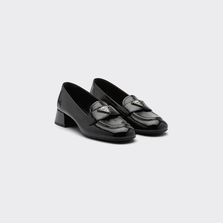 Prada的这款乐福鞋采用裂纹漆皮革打造,圆头配搭粗跟,轮廓设计充满柔美的淑女味,同时确保穿用舒适度。鞋身正面饰有金属三角形徽标,秀出品牌的标志特色。