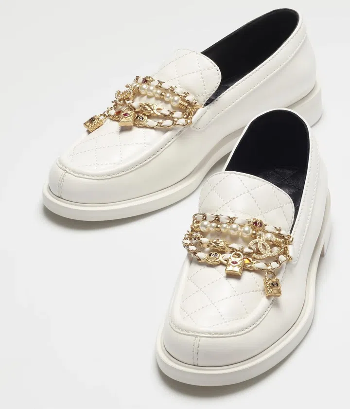 乐福鞋向来予人中性硬朗的感觉,Chanel的这款白色乐福鞋打破规范,以柔软舒适的小羊皮制作,配搭精美的珠宝装饰,注入一股柔美仙气,轻松成为一身造型的吸睛亮点。