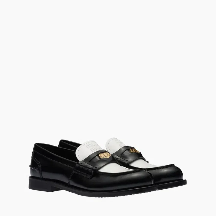 Miu Miu黑白拼色的乐福鞋,充满利落简练的气息,鞋头盖配皮革饰带和金属装饰注入一份精致美,低跟鞋底设计也确保你在职场打拼时,踩着步履轻松来去自如。