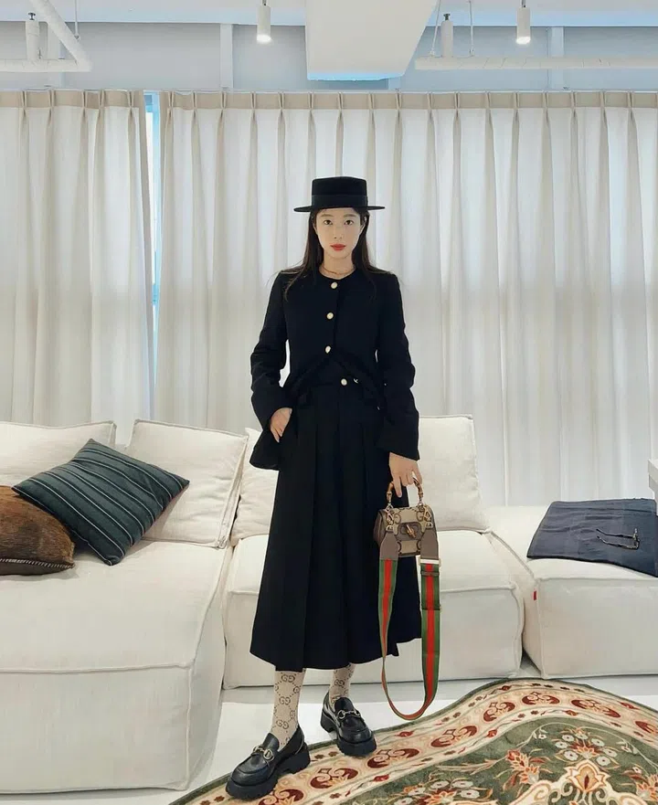 韩国时尚女星郑秀妍(Jessica Jung)在IG分享日常穿搭,各种质感满分的经典单品集于一身。以舒服清新的蓝调为主色,西装外套内衬黑色上衣,配搭休闲牛仔裤,脚踩Chanel的乐福鞋,拎着同品牌的迷你化妆包,优雅中带着率性之美。