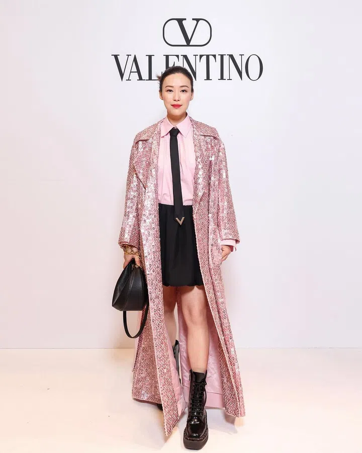 Valentino 2023 秋冬“Black Tie”系列的创作灵感,源自创意总监Pierpaolo Piccioli女儿某次晚间出行的男性风装束。林慧玲身穿新季衬衫与短裙,系上领带,外搭耀眼的粉色亮片大衣,潇洒现身品牌活动。