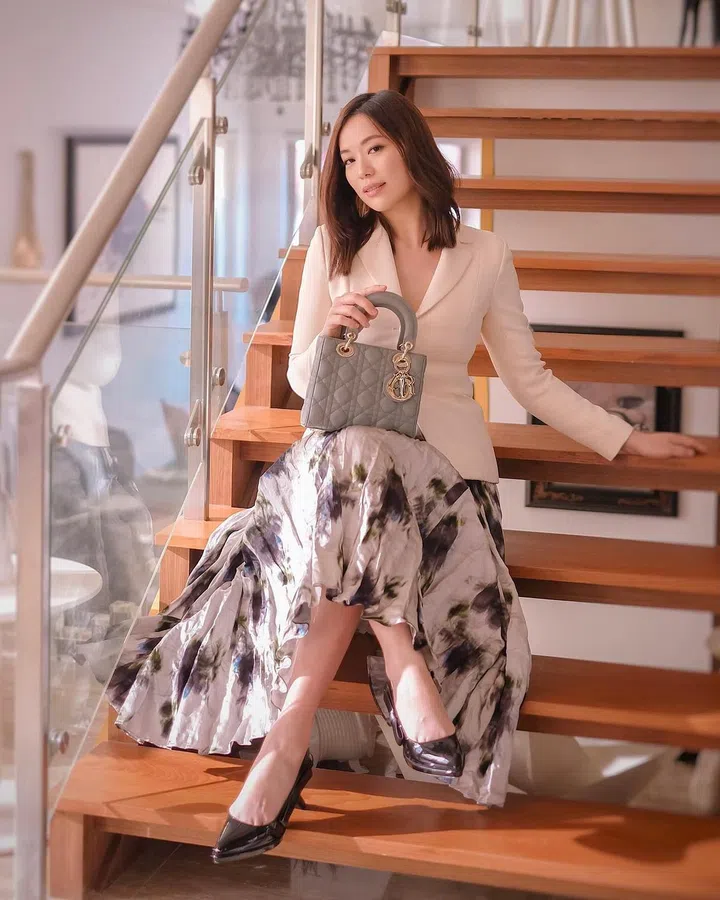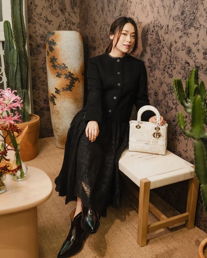 走在潮流前端的的林慧玲,率先演绎Dior 2024早春造型。她身穿黑色初剪羊毛混纺面料短款外套与棉质混纺蕾丝科技面料喇叭形半身裙,搭配Lady D-Lite手袋,轻松诠释品牌的优雅气质。