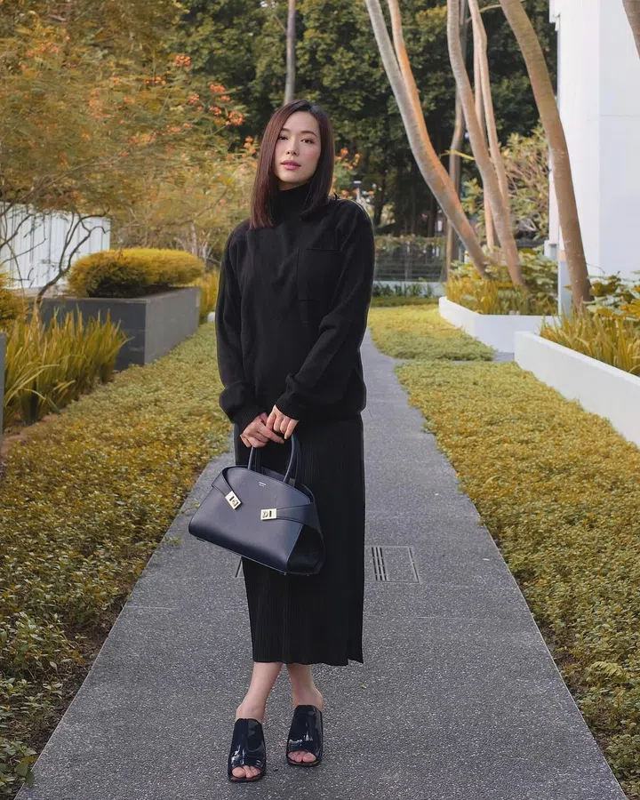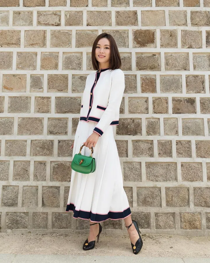 步入秋冬,衣橱里少不了一袭优雅的针织套装。林慧玲身穿典雅的Gucci衣装,缀有撞色条纹,提升了精致度。手提品牌经典Gucci Bamboo 1947手袋,绿色的迷你包瞬间点亮了整体造型。