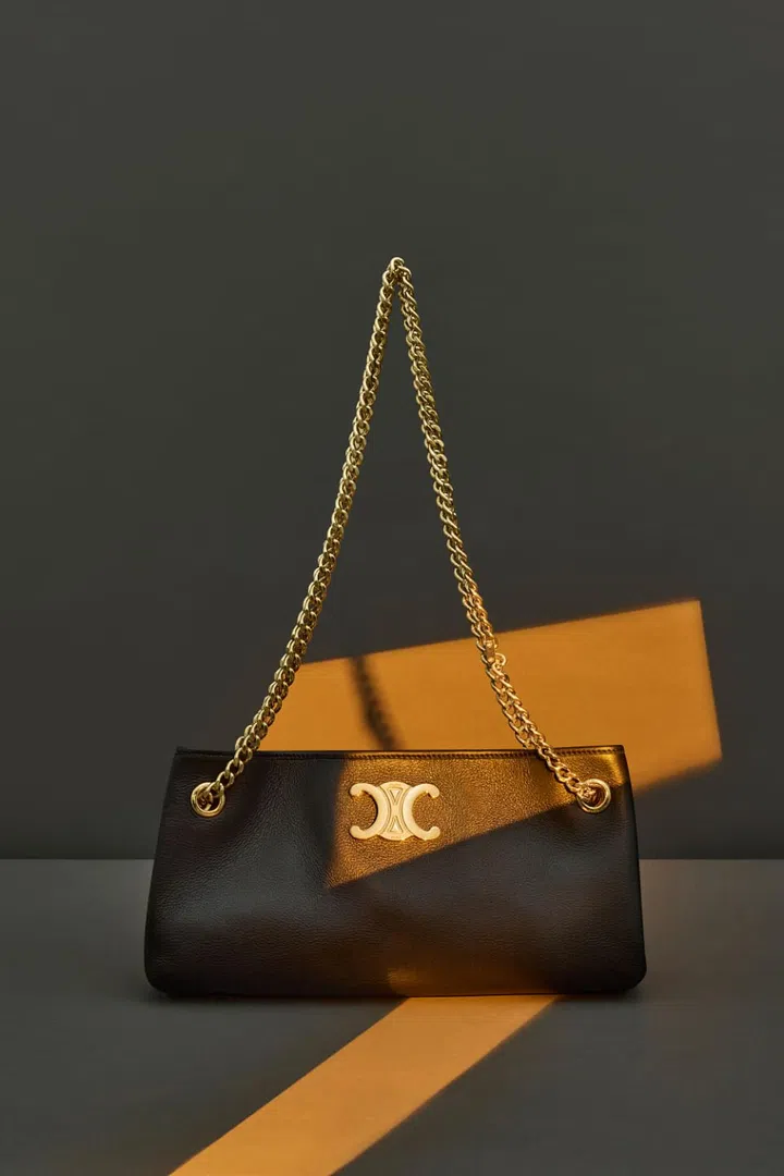 Wiltern Clutch是CELINE Triomphe家族的新成员。独树一帜的长梯形包型设计,轻易紧扣目光。采用拉链和磁扣开合的设计,缀有Triomphe 金属凯旋扣。包包也配置了一条可拆卸可调节的皮革肩带和长链条,随心配搭造型转化不同背法,兼顾日夜装扮。