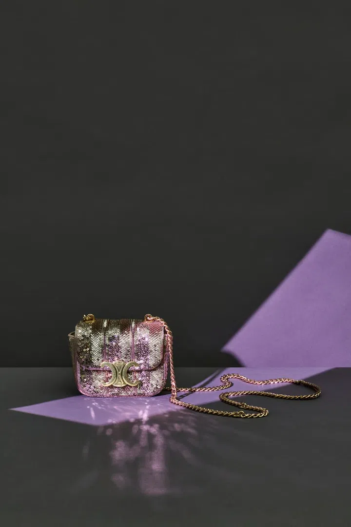 迎接年底的节日派对季,怎能少了一款精致小巧的美包?迷你型的TRIOMPHE手袋绝对是为造型加分的利器。金银亮片的饰面设计,闪烁着华丽的波光粼粼,配搭长链条肩带,并缀有品牌标志性的Triomphe凯旋扣。完美融合了Hedi Slimane 钟爱的复古摇滚与好莱坞浮华风格,让女人化为闪亮星星,在派对上绽放美丽光芒。