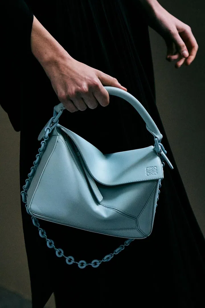 Loewe 2022秋冬系列在成衣和鞋履中融入气球、汽车、嘴唇等元素,呈现诙谐又怪诞的超现实主义风格。Puzzle 手袋以油彩色调亮相,亮点是五金件点缀包身同色涂漆搭配同色涂漆的甜甜圈链条,为冬日穿搭提供更俏丽的色彩选择。