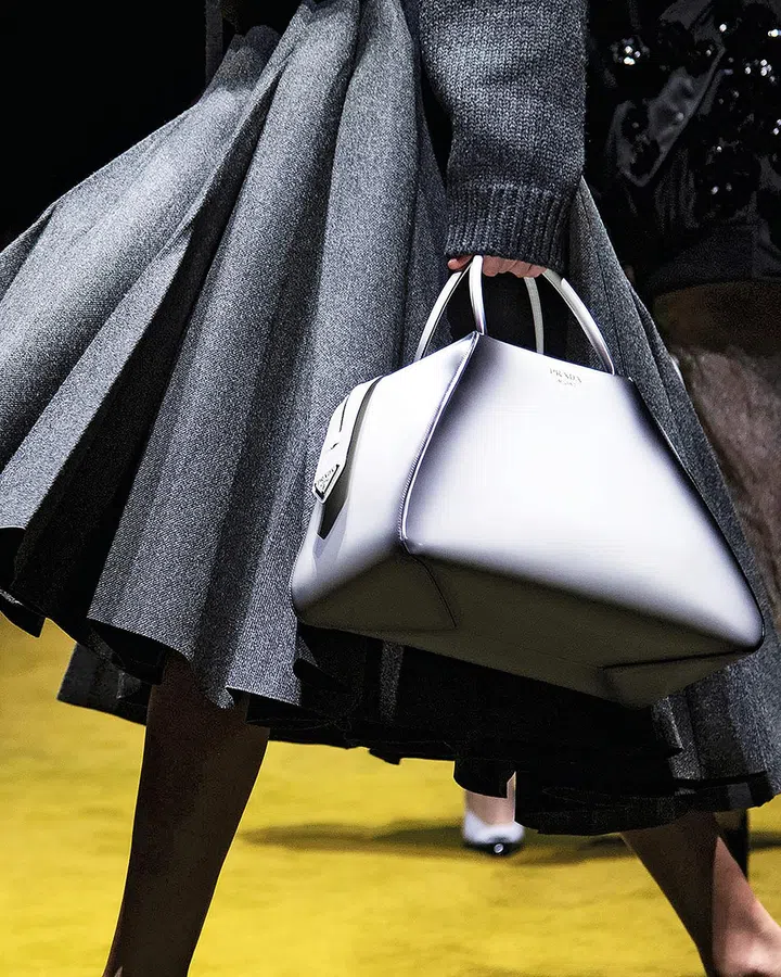 由Miuccia Prada和Raf Simons共同呈现的Prada 2022秋冬女装系列致意生命与生活,秀场上出镜率最高的是全新推出的手提包,饱满的梯形轮廓搭配纯色小牛皮,包身两侧和顶部剪裁出自然凹陷的效果,延续简约的美学理念。其中,漆光质感的手提包共有牛油果绿、马鞍棕、浅粉灰色等配色,拼缝处勾勒出黑色阴影,看起来新颖别致。