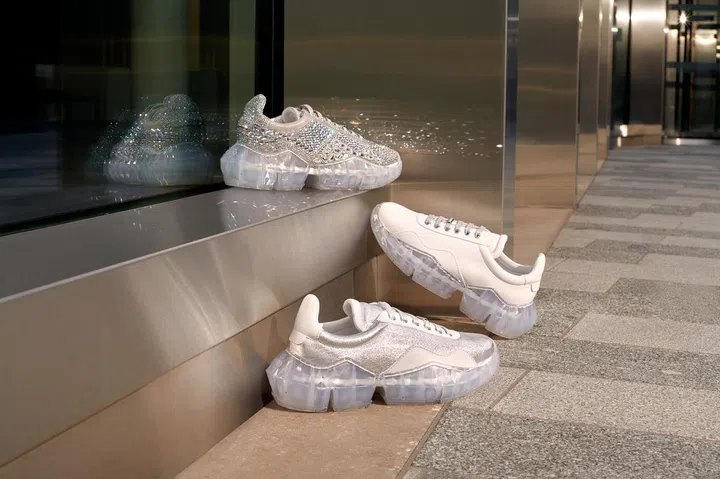 Jimmy Choo去年底推出全新“Diamond”系列,顾名思义,以钻石为灵感,采用新面料和设计工艺打造末来感十足的运动鞋。新鞋参考了近期流行的老爹鞋为鞋款版型,并以复古赛车鞋与钻石的切割轮廓出发,鞋面和鞋底相连形成内层,同时被透明的菱形外层包覆,呈现强烈的视觉效果。想要为造型增添亮点,可选择嵌上Swarovski水晶的Diamond运动鞋,无论哪个角度,都能让你闪亮迷人。
