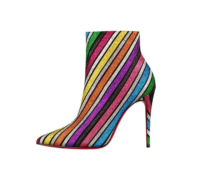 出自Christian Louboutin 2019春夏系列,这双So Kate Booty高跟鞋的灵感源自迪斯科的狂热,采用绒面革与彩色条纹亮面,让鞋履充满闪亮光芒,安置在100mm毫米鞋跟之上,每一步都能彰显Louboutin女郎的魅力与自信。