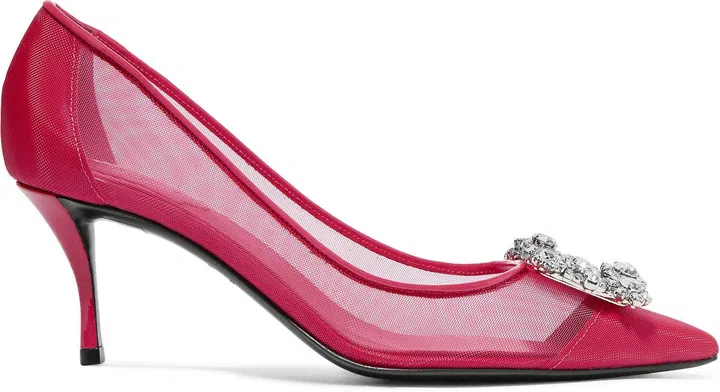 Roger Vivier 这双Flower中跟鞋,采用亮粉色网布,并饰有闪亮的漆皮边。你可以短裁裤装或中长裙装搭配,露出尖头处的经典水晶搭扣,瞬间将其变成造型的焦点。