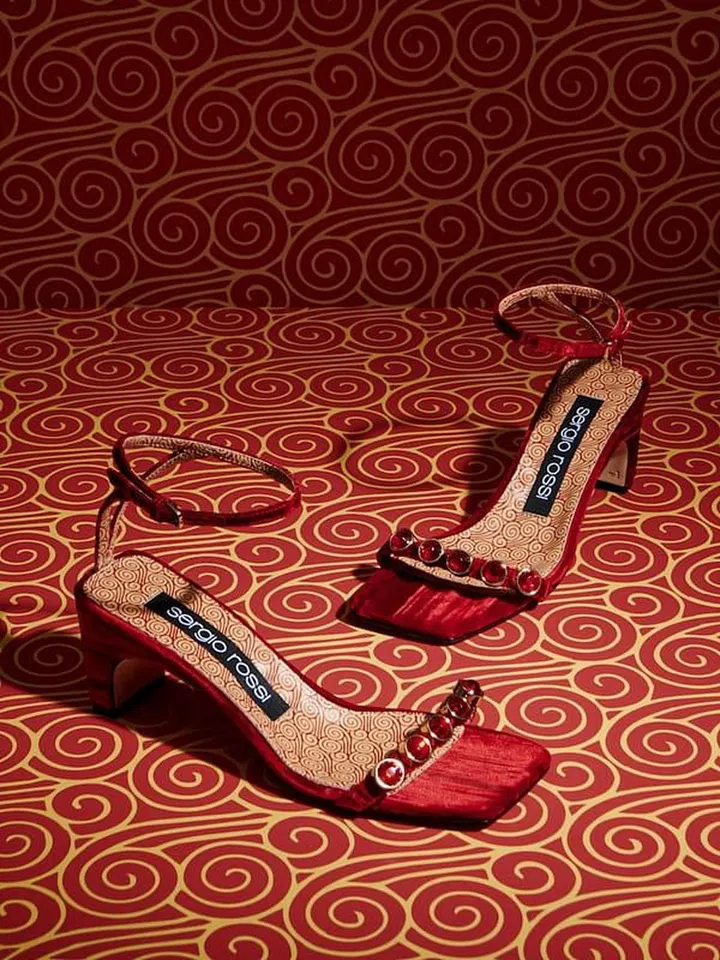 为庆祝农历新年,Sergio Rossi特别推出SR1红色天鹅绒水晶配饰中跟凉鞋,此款为品牌经典的方头凉鞋,一字带上镶嵌红色水晶,充满节日喜庆色彩。