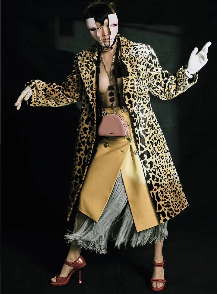 金属和皮革AirPods保护壳(作为项链)、皮包(戴在脖子上)、粘胶纤维流苏半身裙、皮裙、皮革高跟鞋/Prada;黄铜与石英项链/Celine;粘胶纤维混纺大衣/Miu Miu;羊毛手套/Gucci。