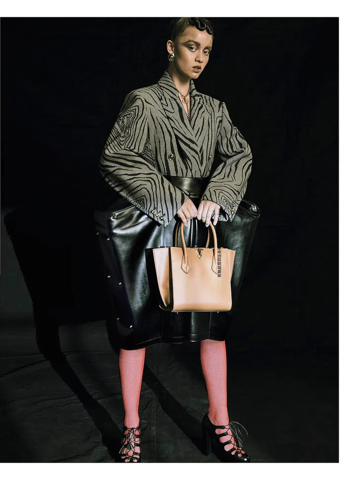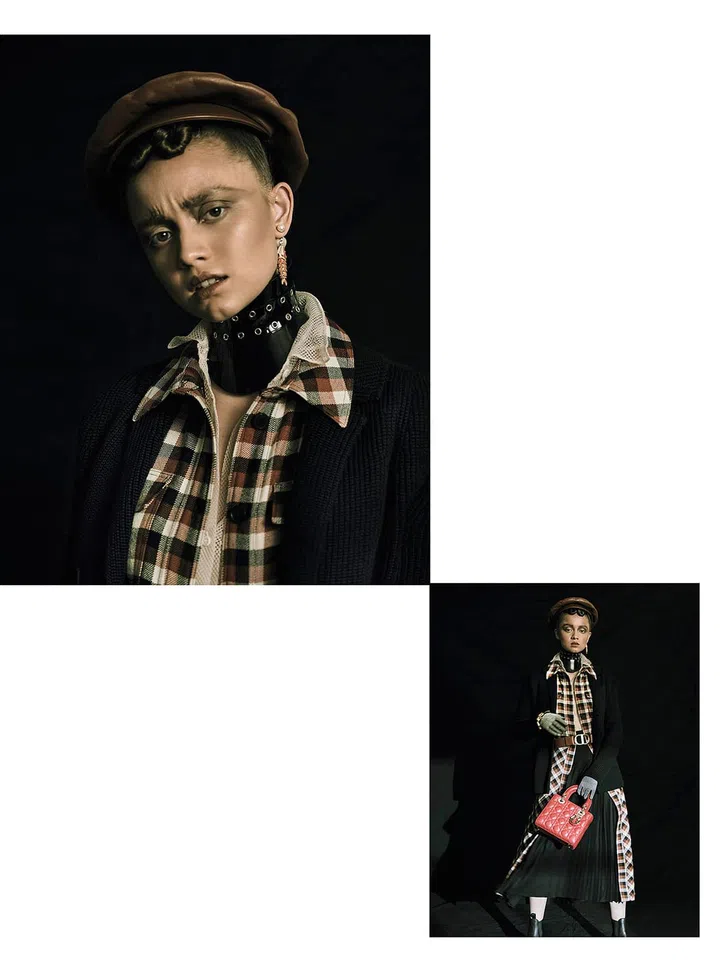 羊毛混纺帽、黄铜项链、羊毛混纺上衣、初剪羊毛裙、皮革高跟鞋/Givenchy;皮革与金属手镯(右手)/Hermes;树脂与金属手镯(左手)/Chanel;帆布包/Dior。