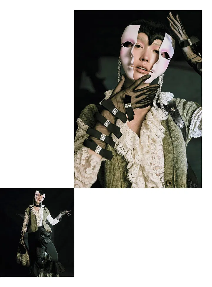 水晶耳环、棉质混纺上衣、马海毛背心、皮革背带、薄纱手套/Gucci。