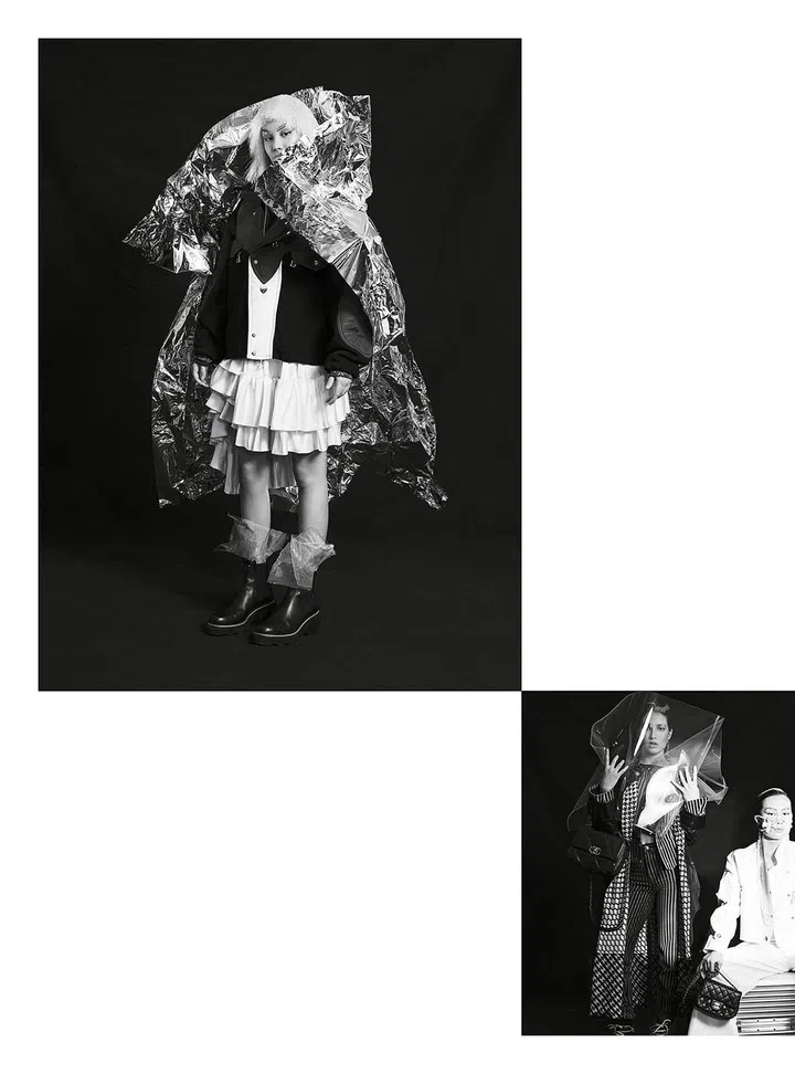 左至右:(模特Lila)金属和树脂耳环、棉混纺上衣(内搭)、牛仔外套、牛仔裤、真丝混纺大衣、皮包、皮靴;(模特Cala)金属和树脂耳环、珍珠和水晶金项链、纯棉T恤、皮夹克、皮革长裤、皮包/Chanel;铝制行李箱/Rimowa。