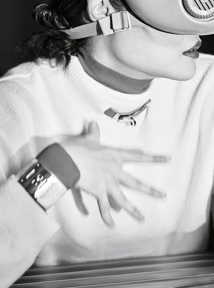 金属头带、皮夹克、尼龙项链/Prada;压克力墨镜/Dinu Bodiciu;黄铜耳环/Dior;羊毛胸衣和内裤、真丝混纺连衣裙、皮靴/Miu Miu。