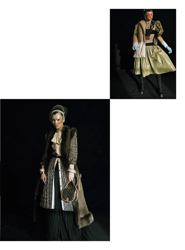 水晶发带/Gucci;真丝上衣、醋酸纤维混纺长裤、粘胶纤维连衣裙、羊毛背心、皮带、黄铜与石英手镯、帆布袋/Celine。