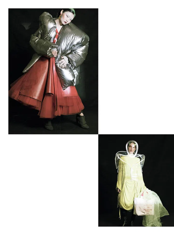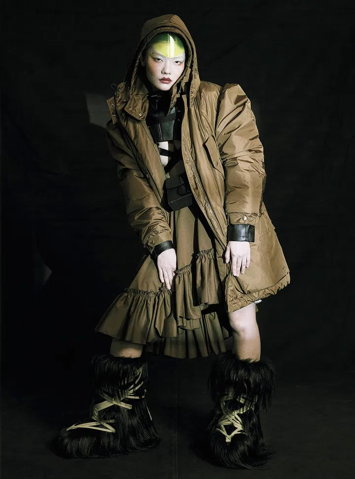 牛角耳环/Hermes;合成皮革和薄纱吊带裙/Junya Watanabe@Club 21;尼龙夹克/Moncler X Rick Owens;羊毛靴/Fendi。