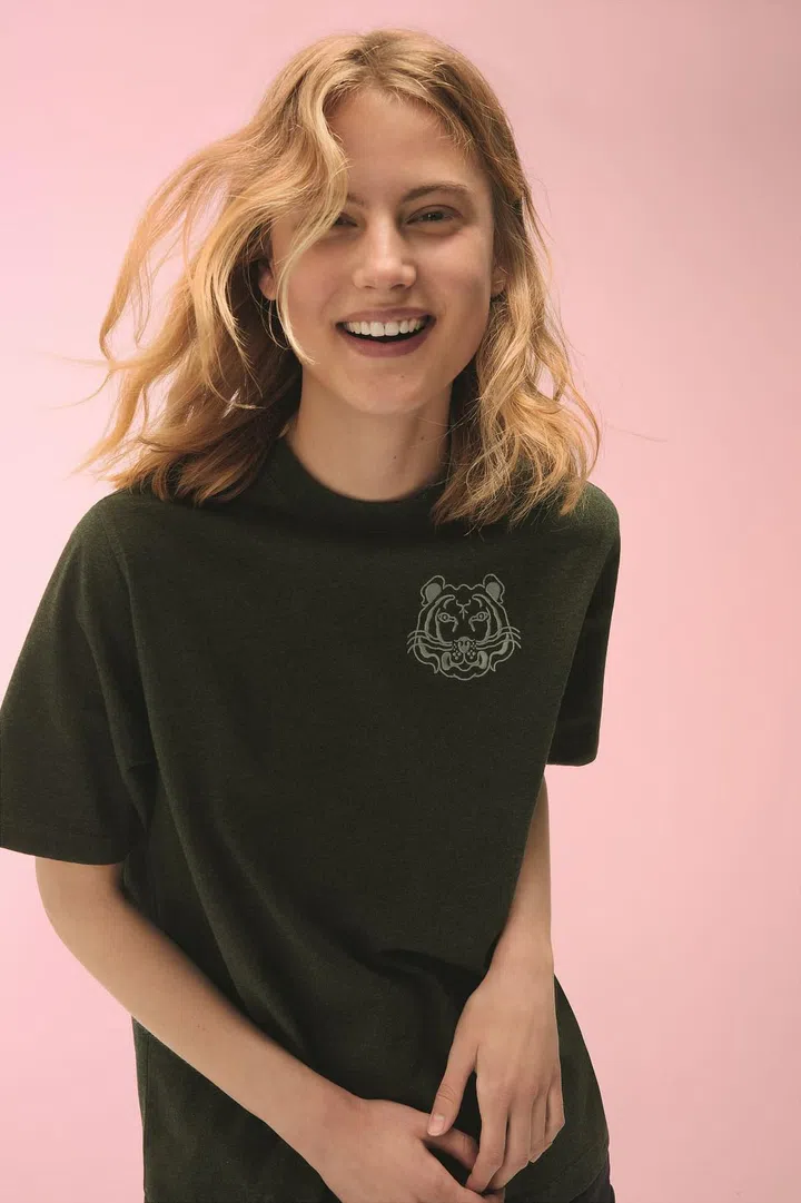 re-renewal(再生)与respect(尊重)。 Re/Kenzo 是一个日常T恤系列,使用库存材料再设计,采用无性别区分,以再生面料搭载浮雕印刷呈现的品牌老虎图案,精巧别致,以杏仁绿、紫红色、灰色、卡其色等传达出对自然的敬意。