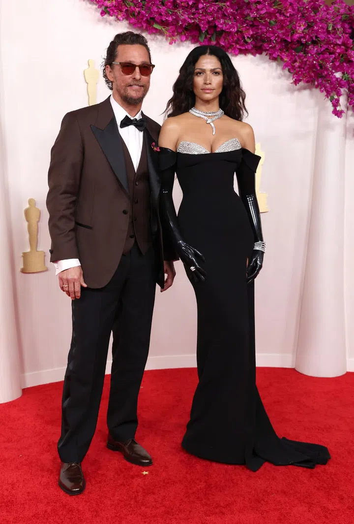 奥斯卡影帝Matthew McConaughey与老婆Camilla Alves McConaughey一同亮相奥斯卡红毯,夫妻俩皆身穿Atelier Versace定制的造型。前者身穿Atelier Versace 定制西装,后者则以一袭Atelier Versace真丝卡迪面紧身胸衣结构礼服亮相,该礼服由6名工匠花了400 个小时才得完成。