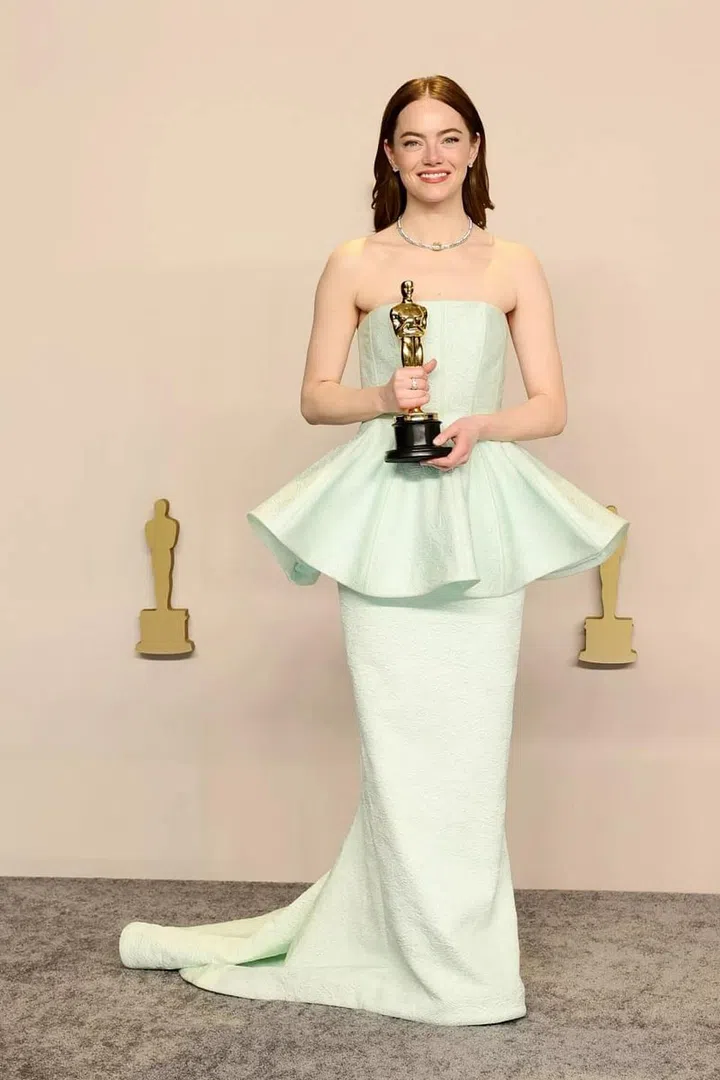 Emma Stone以《可怜的东西》二度封奥斯卡影后,她身穿Louis Vuitton定制的薄荷绿抹胸长裙亮相。
