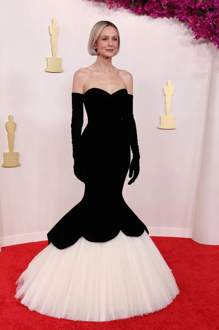 英国演员Carey Mulligan这套丝绒拼接薄纱礼服由Balenciaga特别定制,其设计复刻了品牌创始人Cristobal Balenciaga 1951年冬季系列的经典作品。