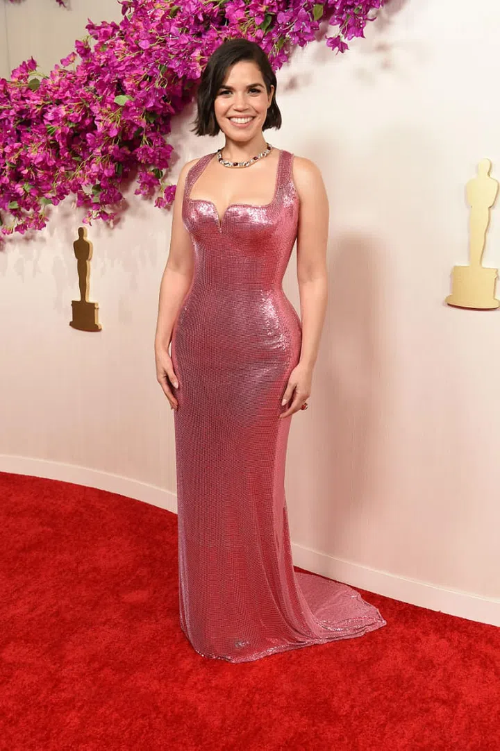 凭《芭比》入围最佳女配角的America Ferrera身穿Atelier Versace定制的粉色金属网布及地长礼服。该礼服由工坊的7名工匠花了400 个小时才得完成。