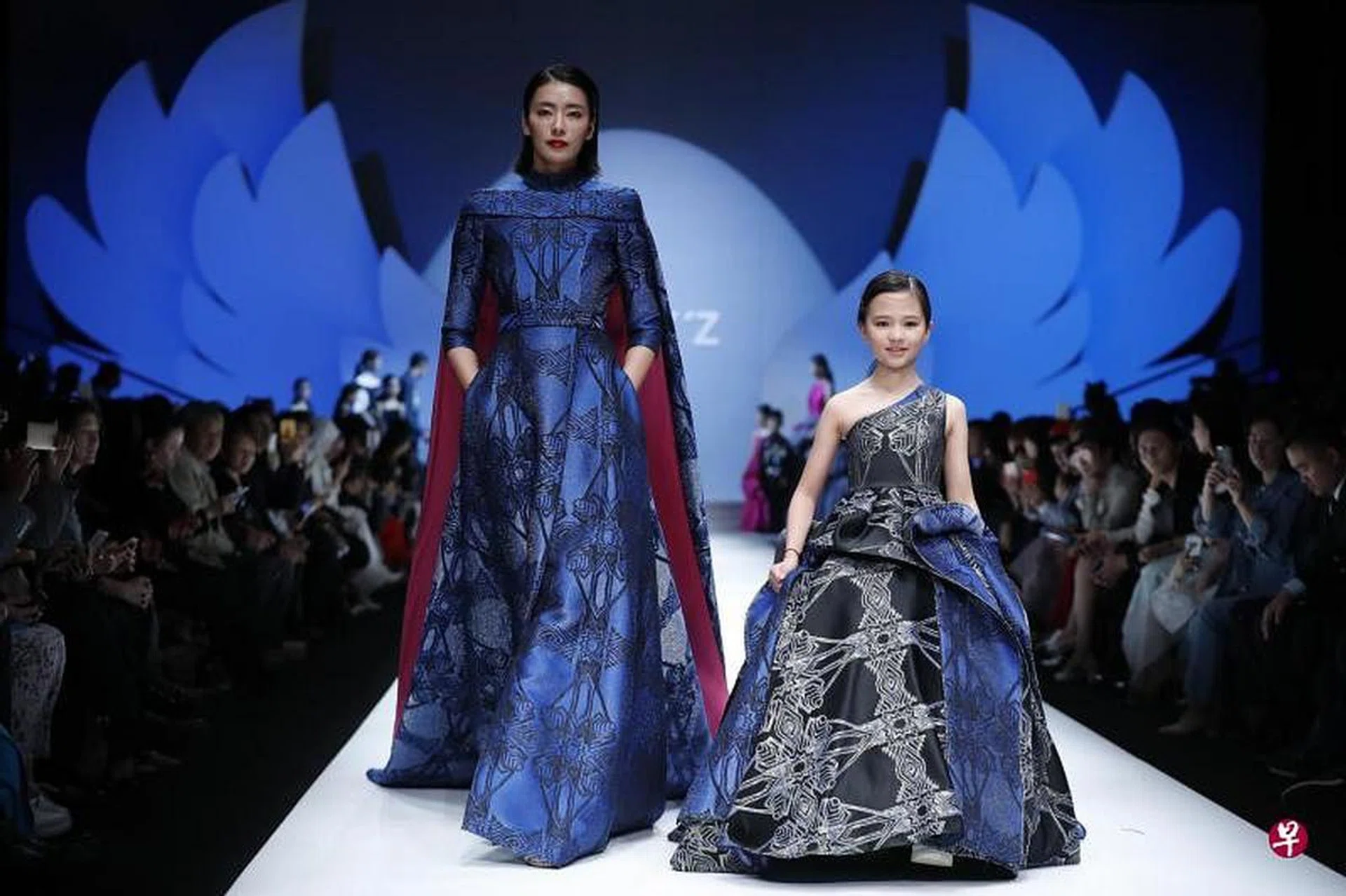 妈妈身穿宝石蓝七分袖连身长裙晚装,披上外蓝里红及地披风,蓝与红展现东方大都会的女王气势;女儿身穿同花色银黑单肩蓬蓬公主长裙,宝蓝色饰边俏皮地呼应妈妈的晚装,母女同心,相映成趣之余又拥有自成一格的个性。