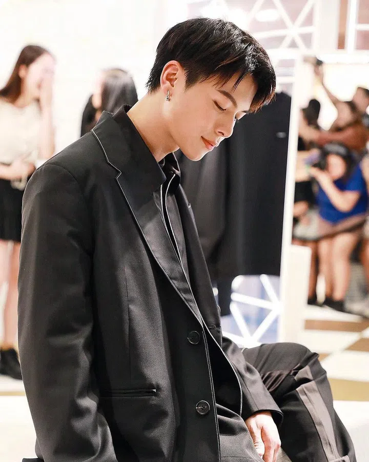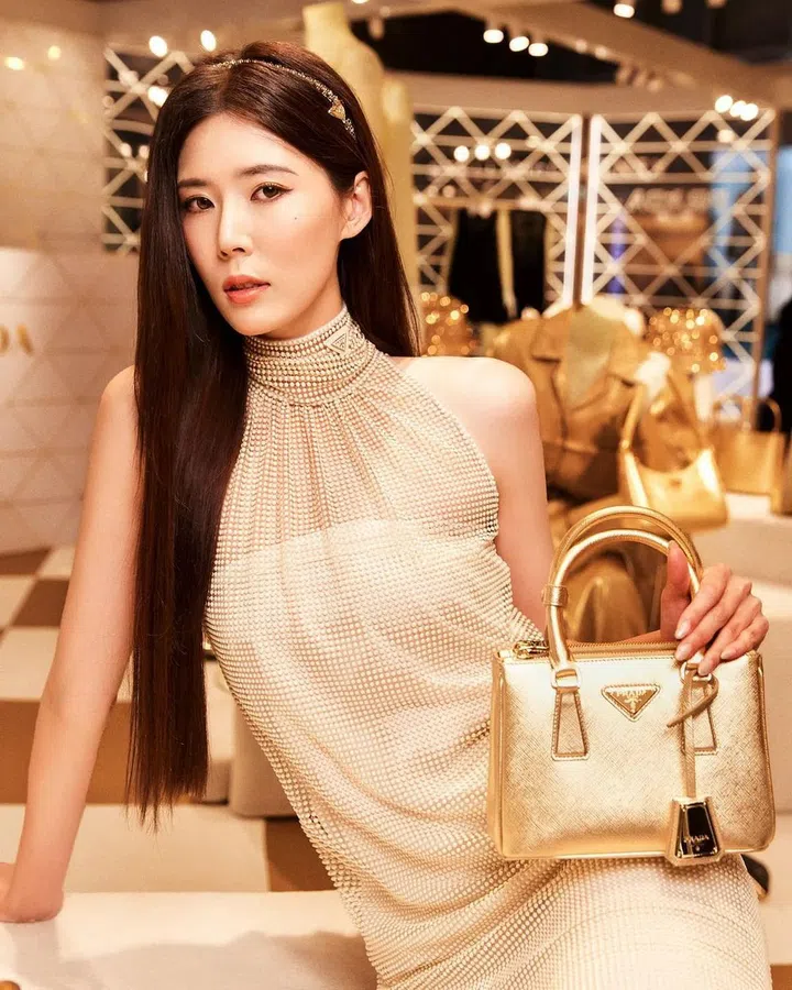 谢宛谕身穿宽松笔挺的黑色西装造型,脚踩新款Prada Cloudbust Thunder运动鞋,身旁放着铂金色Prada Re-Edition Hobo手袋,绑着双丸子头,诠释俏皮风格。