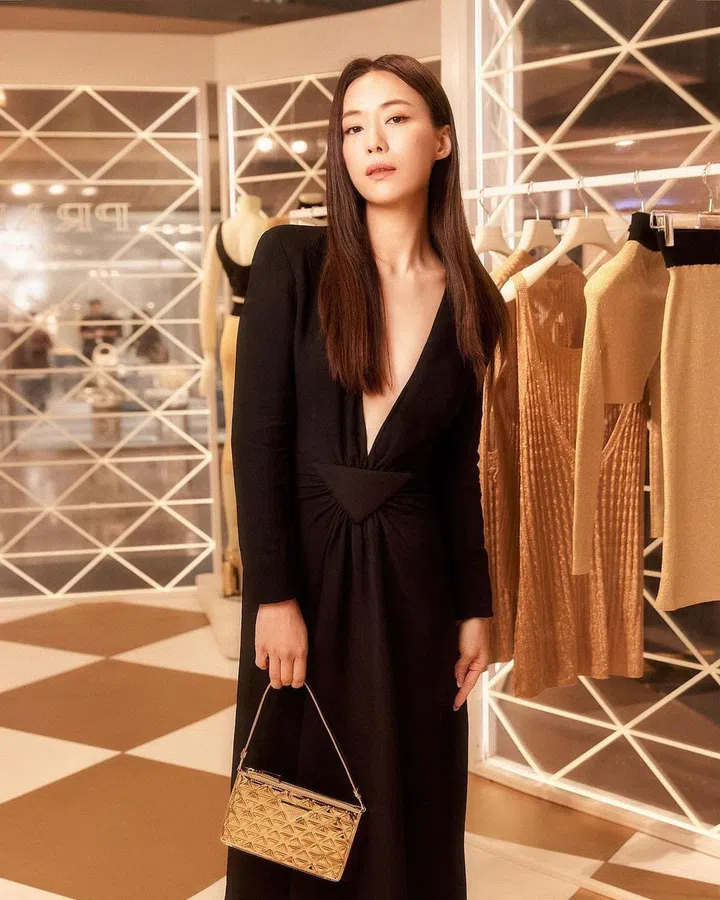 林慧玲身穿一袭Prada黑色低胸洋装,手提饰以涂珐琅三角形徽标的金属质感皮革迷你手袋,散发高雅温婉的气息。