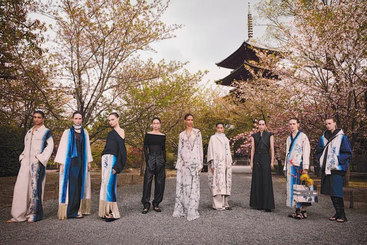 Dior 2025早秋女装系列选址日本京都东寺庭园,于千年古塔与盛放樱花之间揭开序幕。延续与在地工艺社群合作的理念,Chiuri再度携手创立于1894年的龙村美术织物工坊,重现1950年代Dior先生亲自委托设计的经典图案。此次系列也汇聚多位匠人的精湛技艺——京都染色名匠田畑喜八以京友禅技法重新演绎樱花图腾,营造出层层叠叠的柔美色彩;三代同堂的福田家族染织工坊则为面料注入细腻肌理与丰富层次,展现手工艺与时尚语言的深度融合。