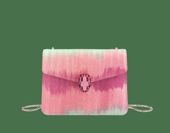 蛇头包,像一件珠宝一样,经典永恒。宝格丽(BVLGARI)全新Serpenti Forever系列Riviera多色珍珠鱼皮斜挎包,采用精致的糖果色设计,汇聚夏日缤纷的浪漫感受。为了确保翻盖到包身的过渡流畅感,必须实行毫厘不爽的精准度,并在皮革表面撒上“闪钻”效果的金属薄片,呈现如梦如幻的色调,展示意大利里维埃拉五彩缤纷的迷人魅力。