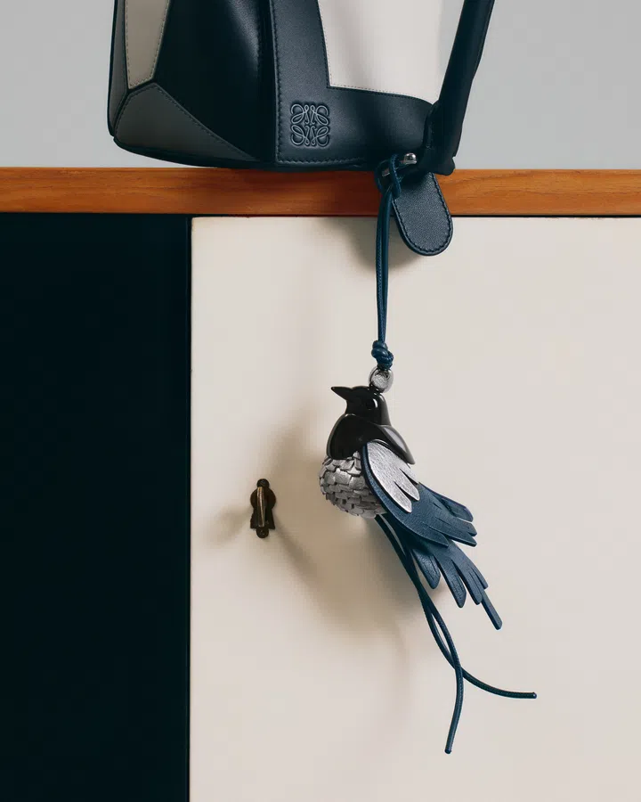 短剧共五集,每集 45 秒,搭配同步释出的剧照与海报,男女主角身着Loewe造型,演绎Puzzle、Flamenco和 Amazona等经典手袋的百变风格。 本次七夕系列的焦点单品是两款独家Ola手袋:一款为深蓝色光滑小牛皮,另一款则为银色压膜小牛皮,均搭配金属甜圈链和系列主题的喜鹊挂饰。系列中还包括单独发售的喜鹊挂饰、喜鹊骰子挂饰与挂锁挂饰,趣味细节增添节日氛围,同时让Loewe精品更添个性化表达。