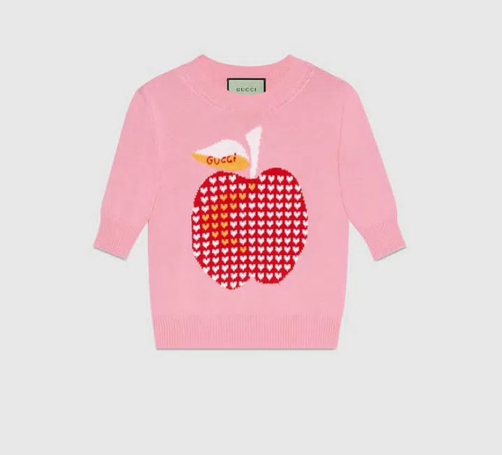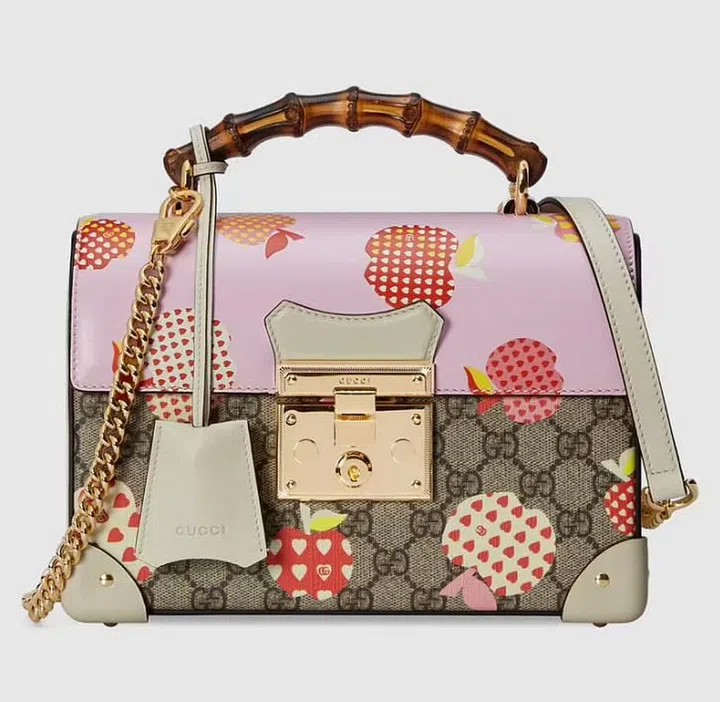 Gucci的七夕限定系列从牛郎与织女的浪漫传奇故事中撷取灵感,以“苹果”作为主角,将浪漫的爱心和苹果图案结合,像贴纸般装饰在老花帆布包包上。这款小号Padlock系列肩背包也采用了趣味盎然的古驰心苹果图案呼应该主题。